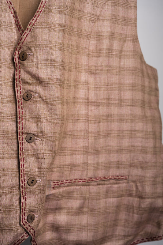 Brown Checks Embroidered Linen Vest