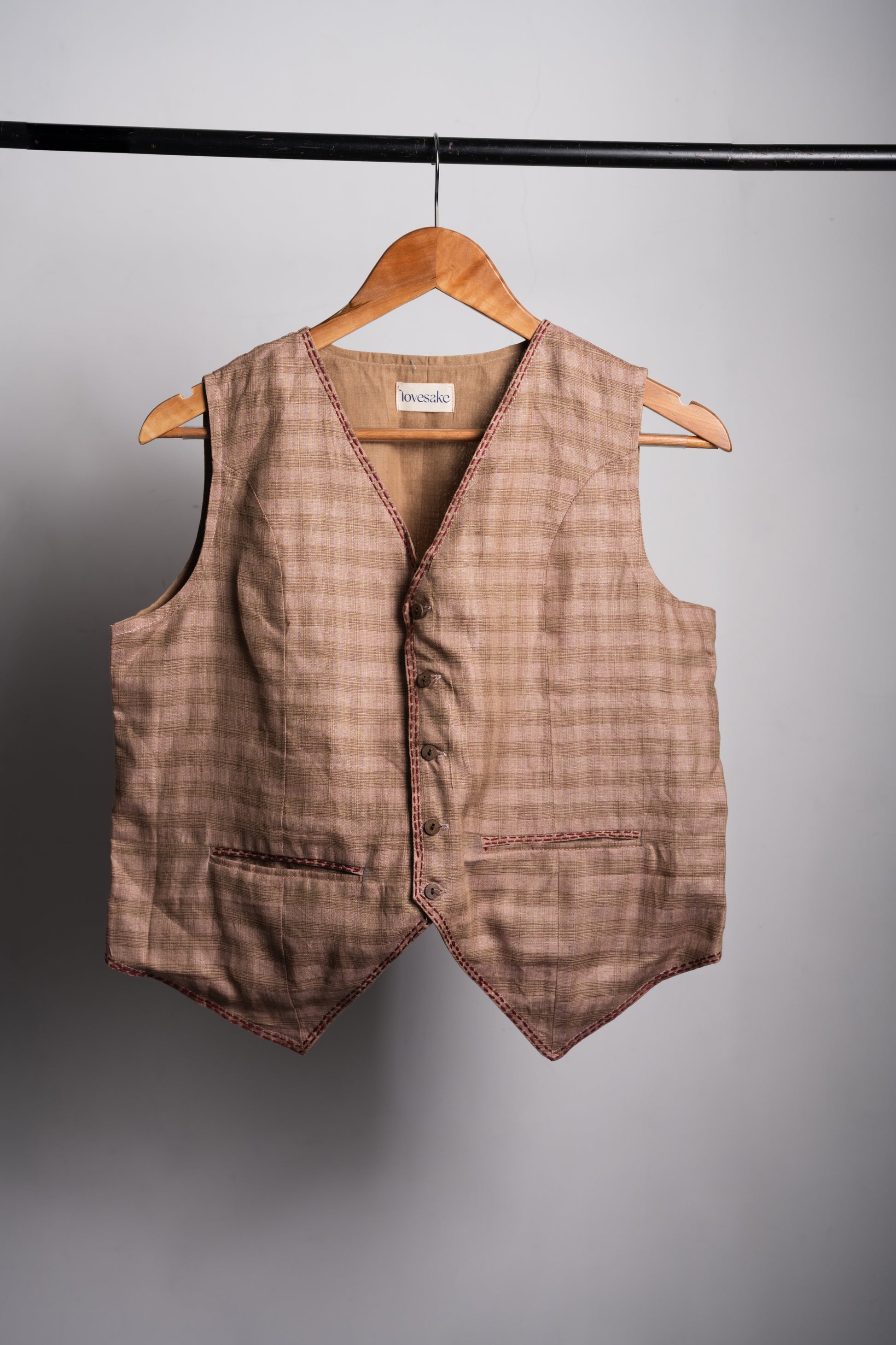 Brown Checks Embroidered Linen Vest