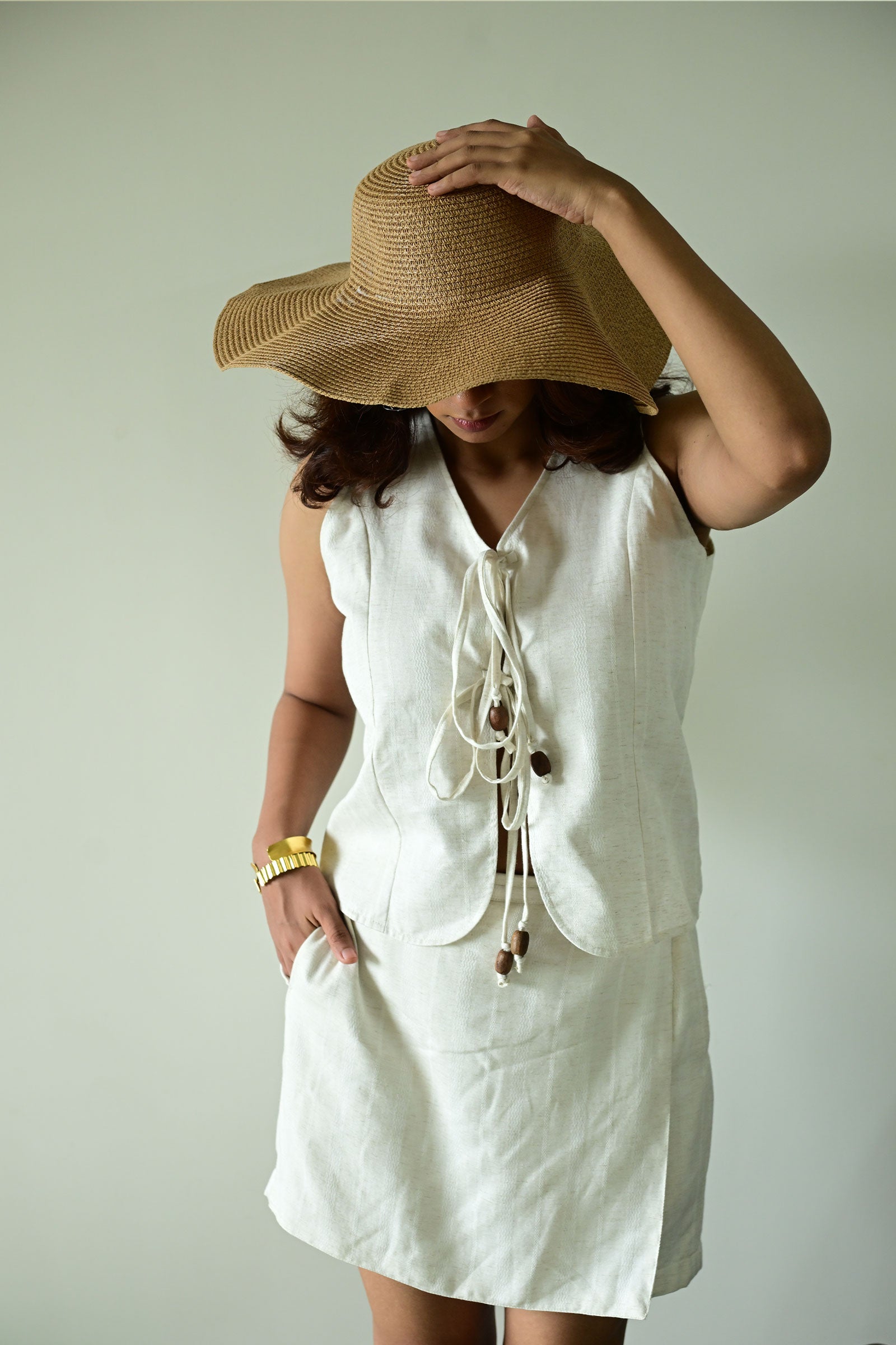 This textured cotton-linen co-ord features a fully lined vest with delicate beaded details and a matching skort that’s secretly pocketed for ease. Summer dressing, simplified. ☁️✨